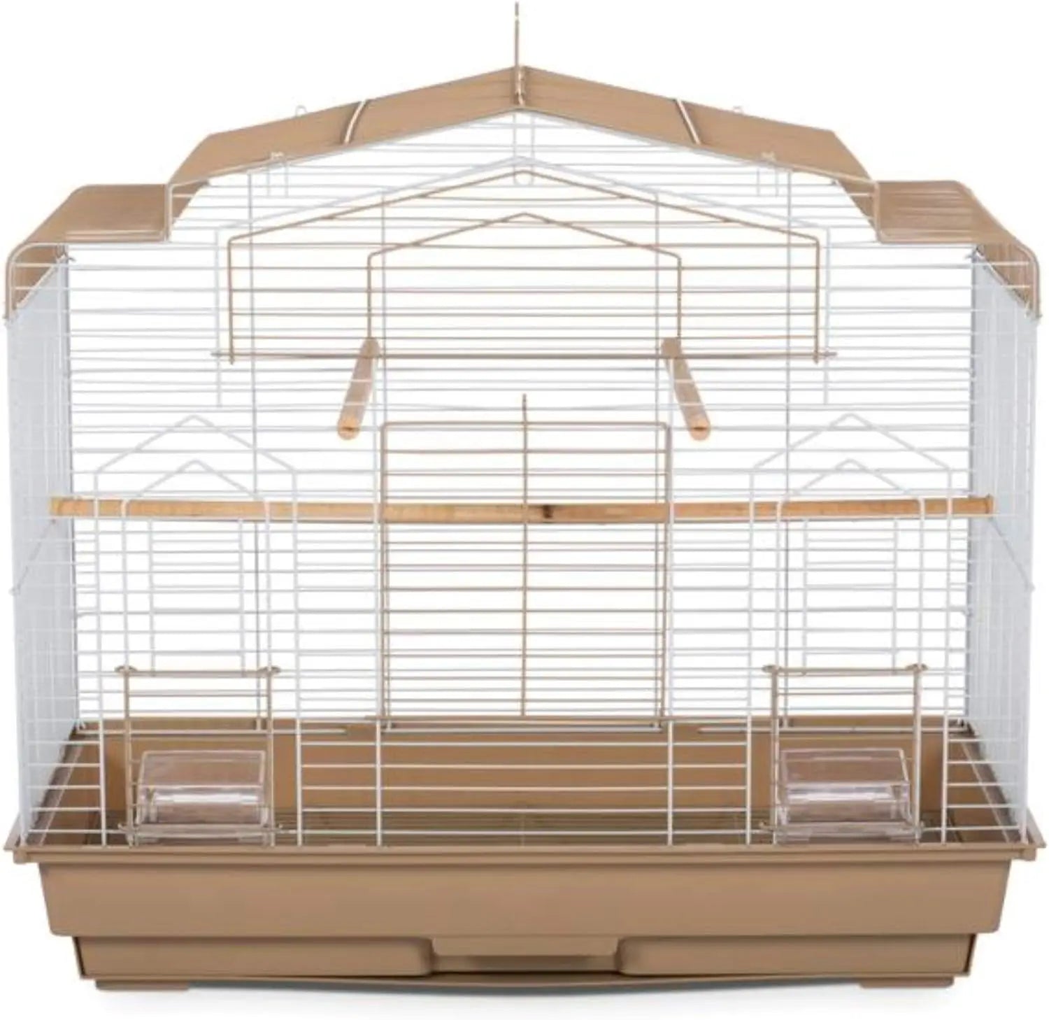 This cage boasts unique architectural details throughout its design, highlighted by two colors of contrasting wire mesh for an appealing aesthetic.